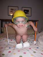 Shortly after watching skiing Cameron decided to begin preparing for the 2014 Olympics in Sochi, Russia. He is using top of the line equiptment; Luvs diapers for skis, a plastic construction hat, two pointers for poles and plastic goggles. He is currently looking for a sponser to purchase a uniform or else he will have to ski naked and that won't be good for his scores.